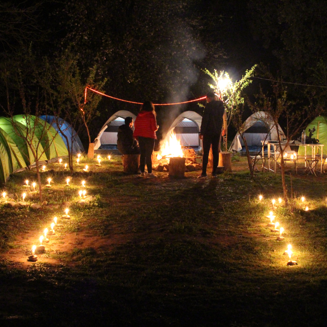 Feu de Camp : Cercle autour du feu avec une ambiance apaisante et une sensation de réconfort et de proximité avec la nature.
